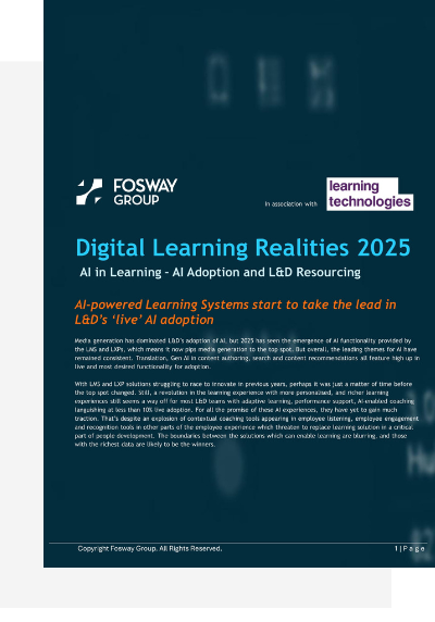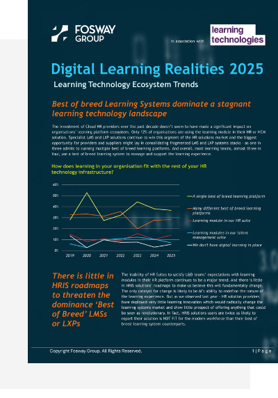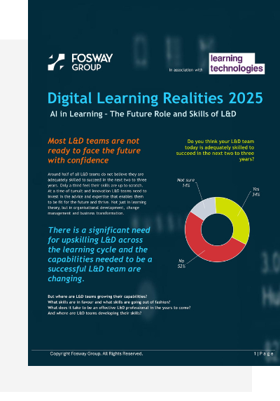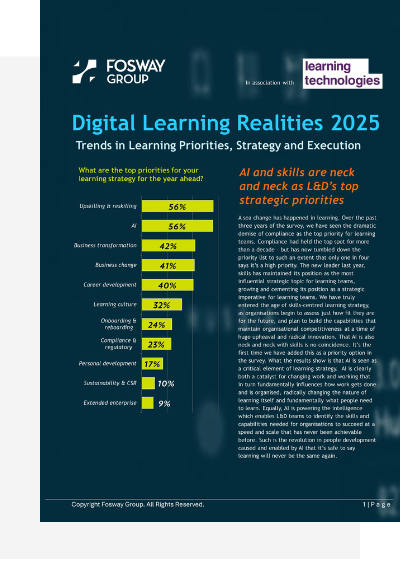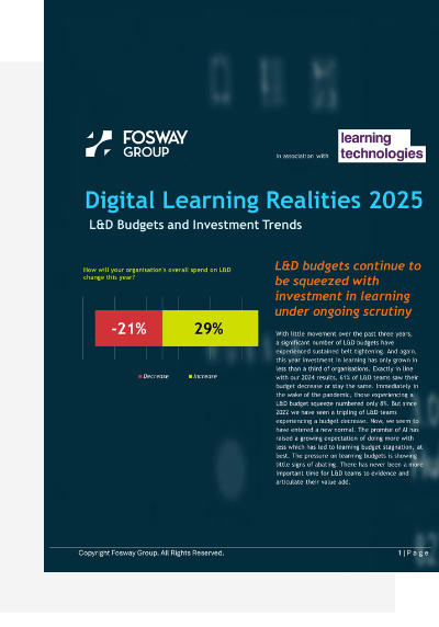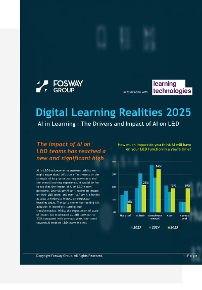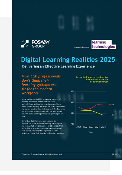 After more than a decade of partnering with Learning Technologies, Fosway has gathered an unparalleled dataset looking into how L&D teams are navigating the rapidly changing world of work. This year’s research digs deeper than ever – uncovering how organisations are using AI, approaching their budgeting, and redefining the future of workplace learning.
