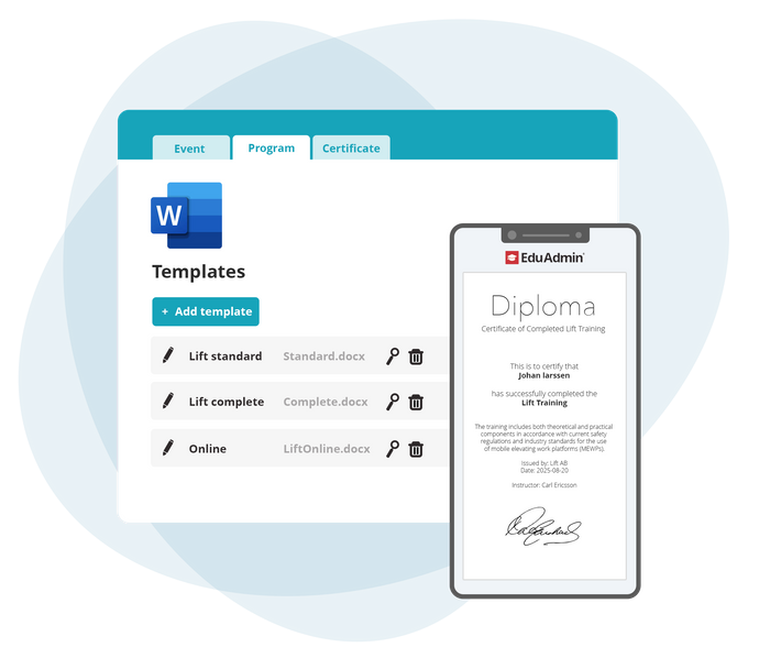 With EduAdmin, handling certificates and diplomas becomes both simple and professional. The system allows you to create, customise and distribute diplomas directly to your participants – completely automatically.